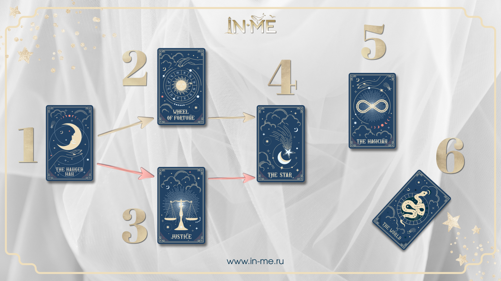 Схема 5+1: перетасуйте колоду и выложите 5 карт, как показано на схеме. Если в процессе тасовки карта или две впали из колоды сами, положите ее/их на позицию 6 и обращайтесь к ним согласно инструкции ниже.